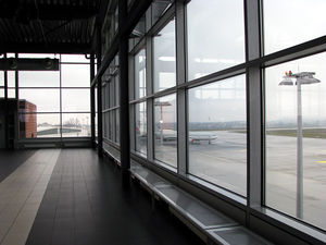 In the Terminal A is a visitor platform on the third level, this point is inside the building. In front of the Terminal, on the right side, is a glass wall, from this point you have a view on the apron.